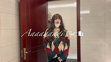 "Cute shemale in wide-fitting sweater Duck shoes in a public toilet"