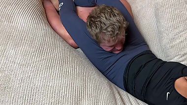 "Cruel Headscissors in Blue Leggings on the Couch"