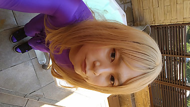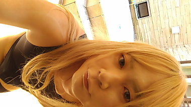 "A blonde cross-dressing boy wore a black swimsuit and masturbated in an open-air bath and felt good!"