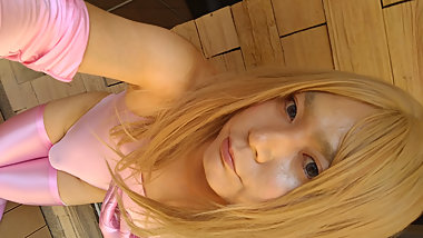 "A blonde cross-dresser in a pink costume got and masturbated!"