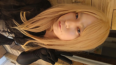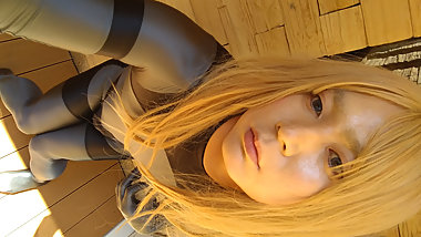 "A blonde cross-dresser changed from a cute dress to pink full-body tights and masturbated!"