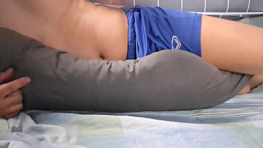 "Playing with a pillow until cum in the condom"